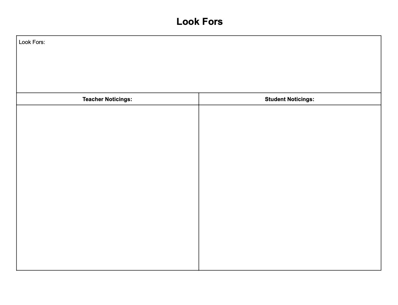 This Look Fors document is one that you can use to remind teachers what they need to “look for” during their observation. Your look fors should be connected to your coaching goal!